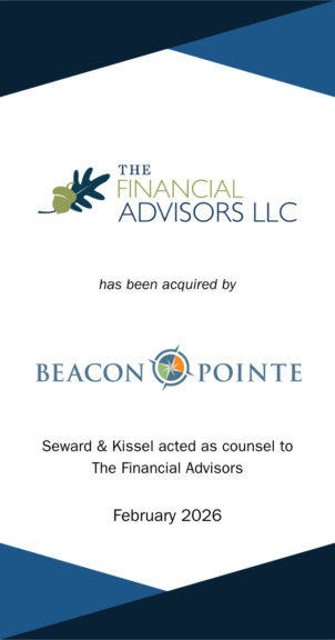 On February 24, 2026, The Financial Advisors, LLC (“The Financial Advisors”), a $1.2 billion AUM firm, announced its acquisition by Beacon Pointe Advisors (“Beacon Pointe”), one of the nation’s largest registered investment advisers with $62 billion of total assets under advisement. Seward & Kissel is pleased to have represented The Financial Advisors in connection with this investment management industry transaction.