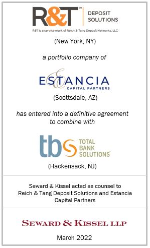 On March 28, 2022, Reich & Tang (“R&T”) and Total Bank Solutions (“TBS”) announced that they have entered into a definitive agreement to combine both companies. Estancia Capital Partners (“Estancia”), a private equity firm based in Scottsdale, Arizona, will have a majority interest upon close. Seward & Kissel is pleased to have represented R&T and Estancia in connection with this financial industry transaction.