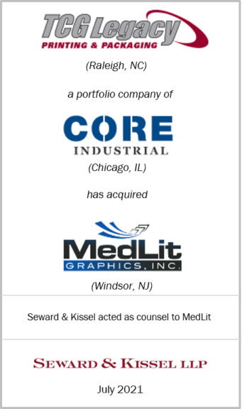 On July 14, 2021, private equity firm CORE Industrial Partners announced that its portfolio company TCG Legacy had acquired MedLit Graphics. Seward & Kissel was pleased to represent MedLit Graphics in connection with this middle market private equity transaction.